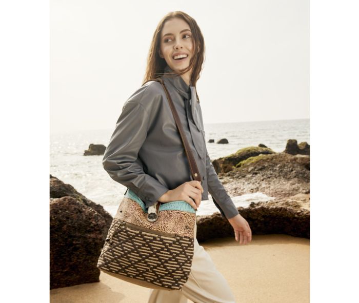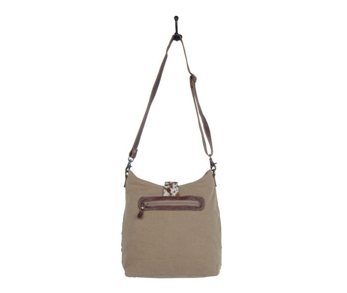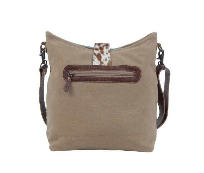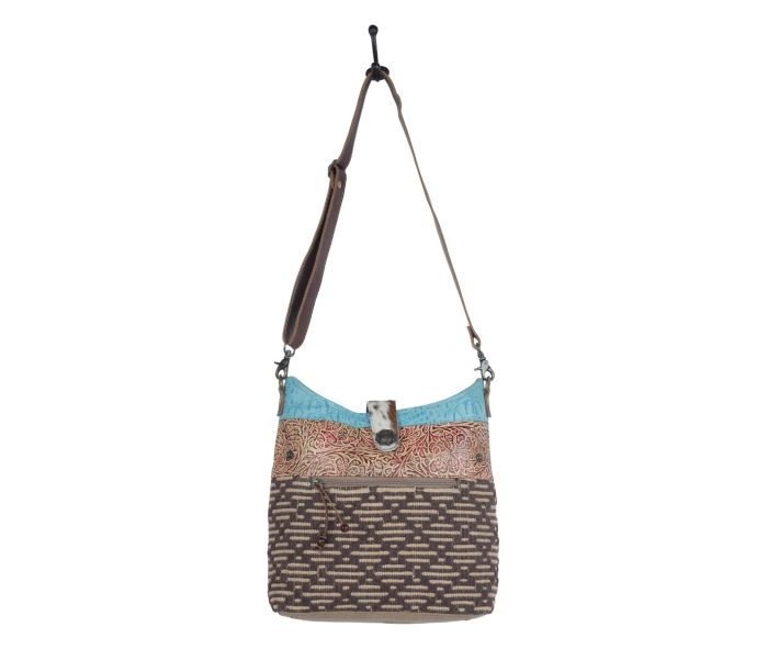 Tan and Brown with hint of tourquiose leather and canvas handbag with tan leather strap geometric print and hairon cowhide snap closure. Additional front and back zip pockets. Cotton lined interior with one zip pocket and two open pockets for storing small items. Crossbody or shoulder.