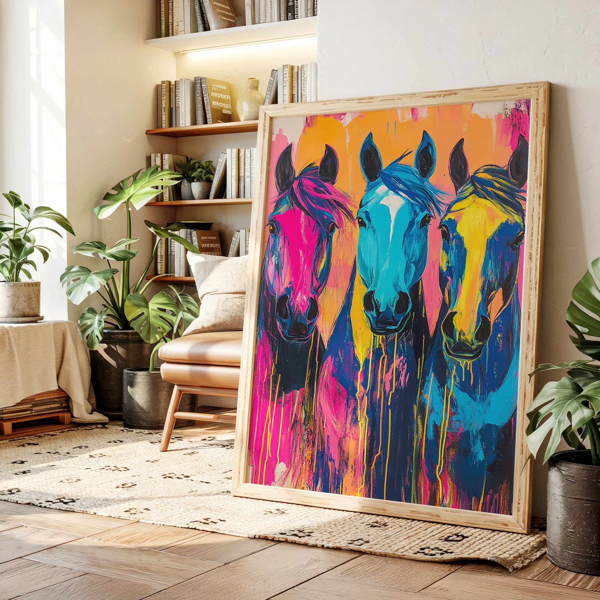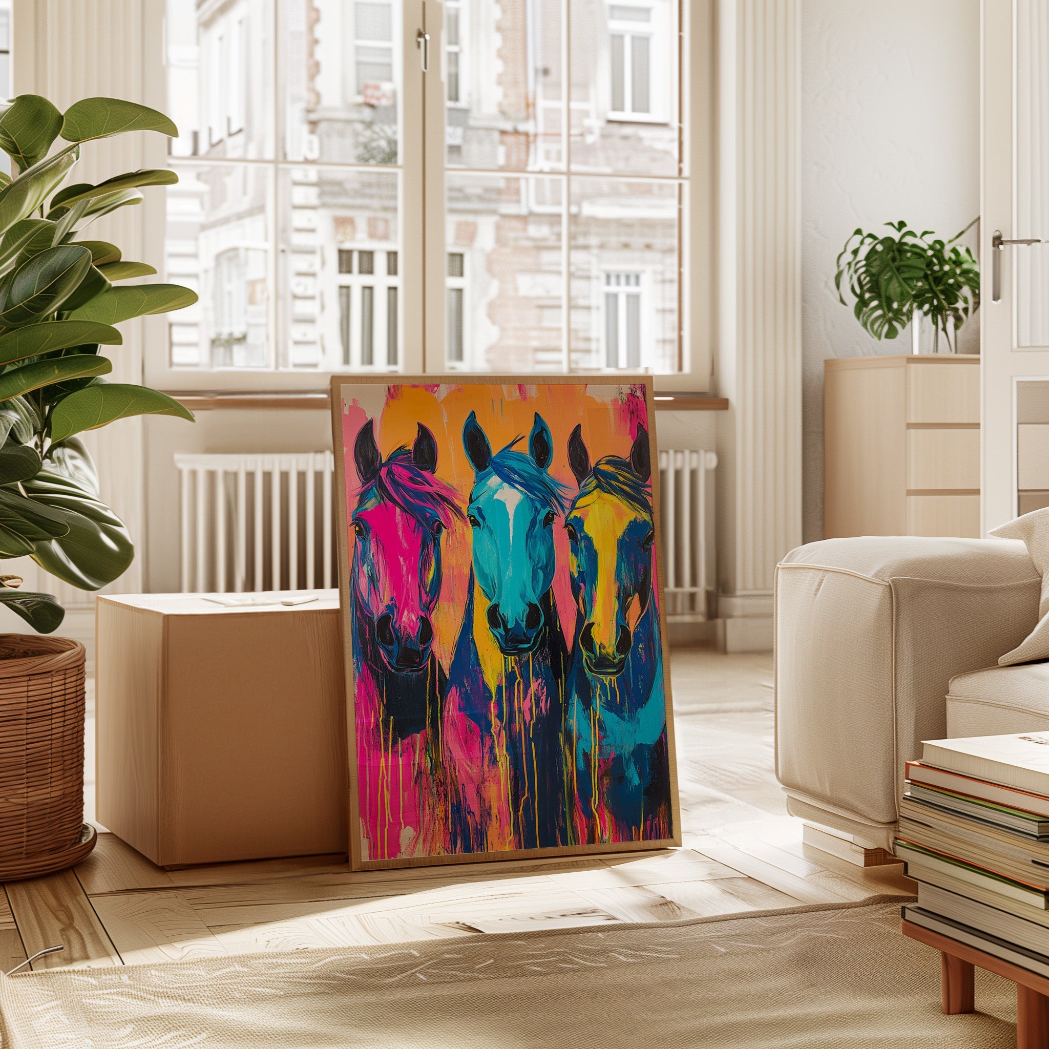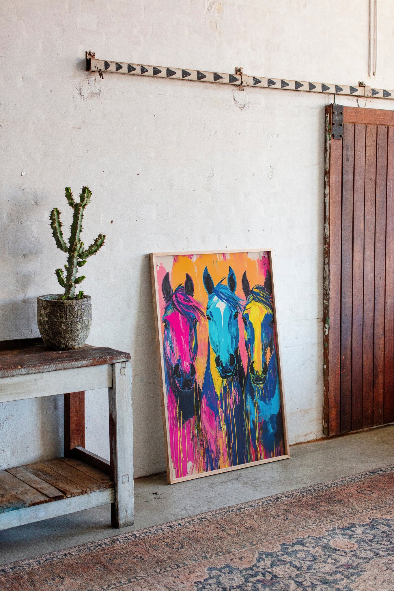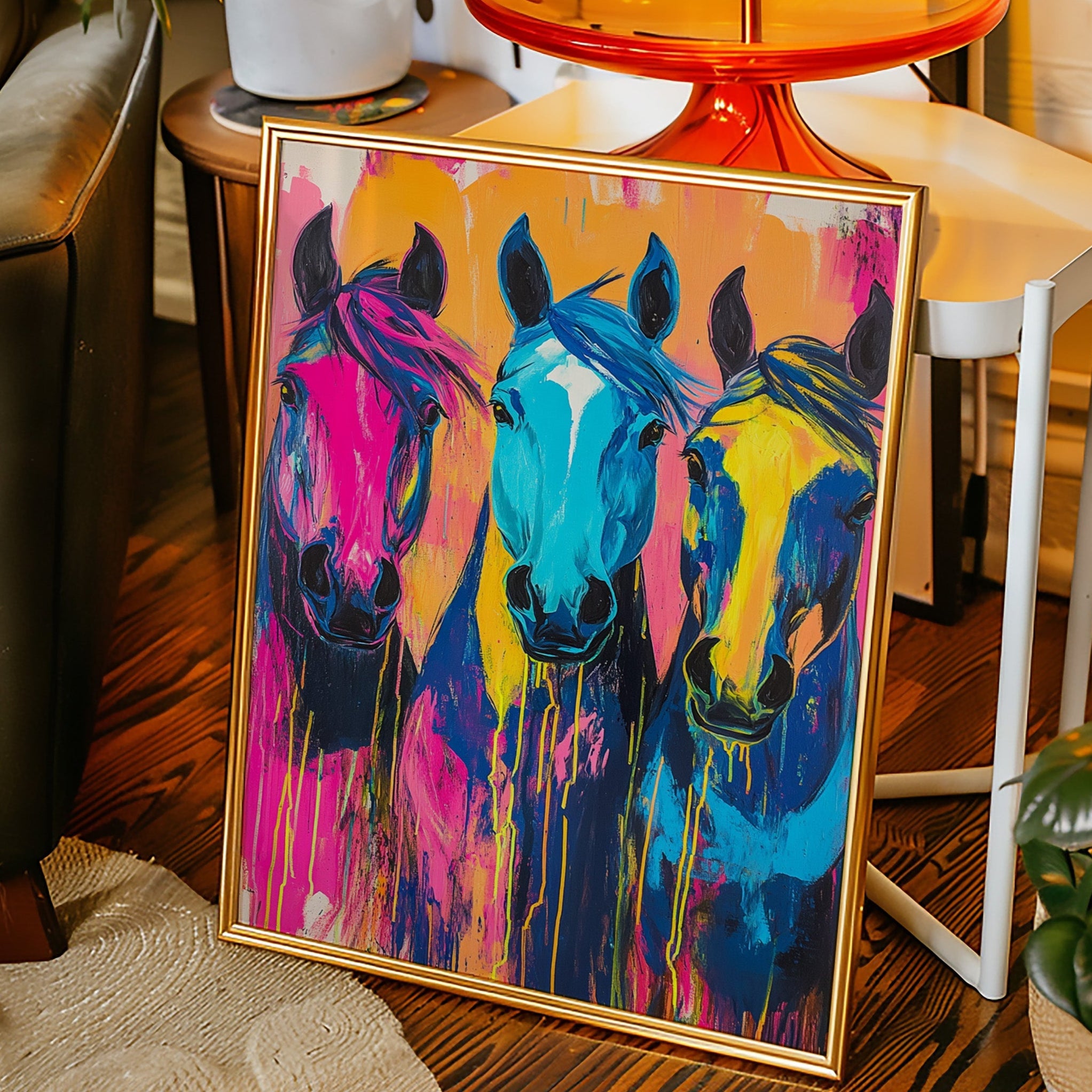 In the fading light, colors burst forth as three spirited horses emerge, their vibrant hues dancing in the evening glow. Part of our Eclectic Bohemian collection, this piece captures the untamed energy of the wild. A bold statement for living rooms, creative studios, or eclectic galleries. Each artwork is crafted with vibrant care to bring an explosion of color to your space.