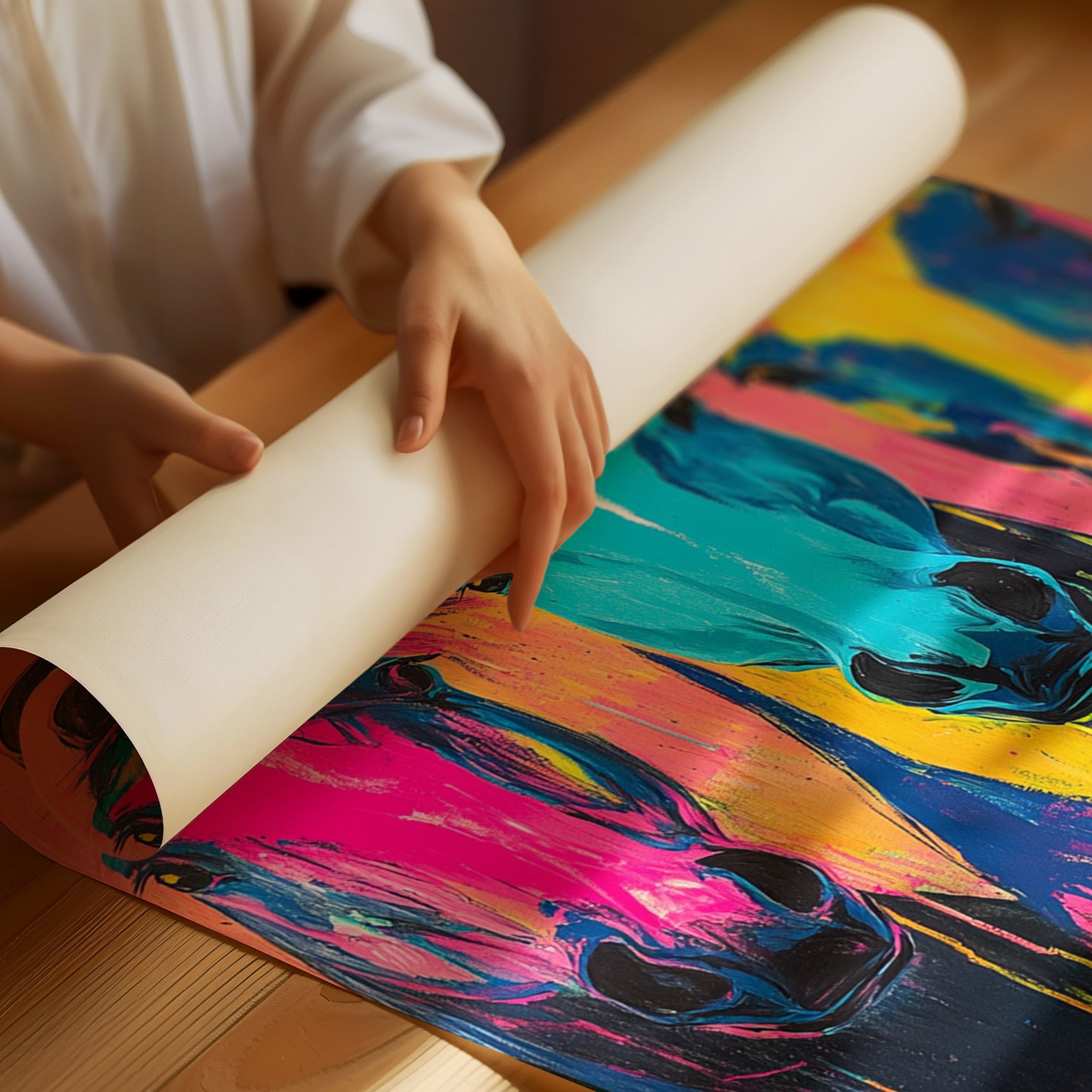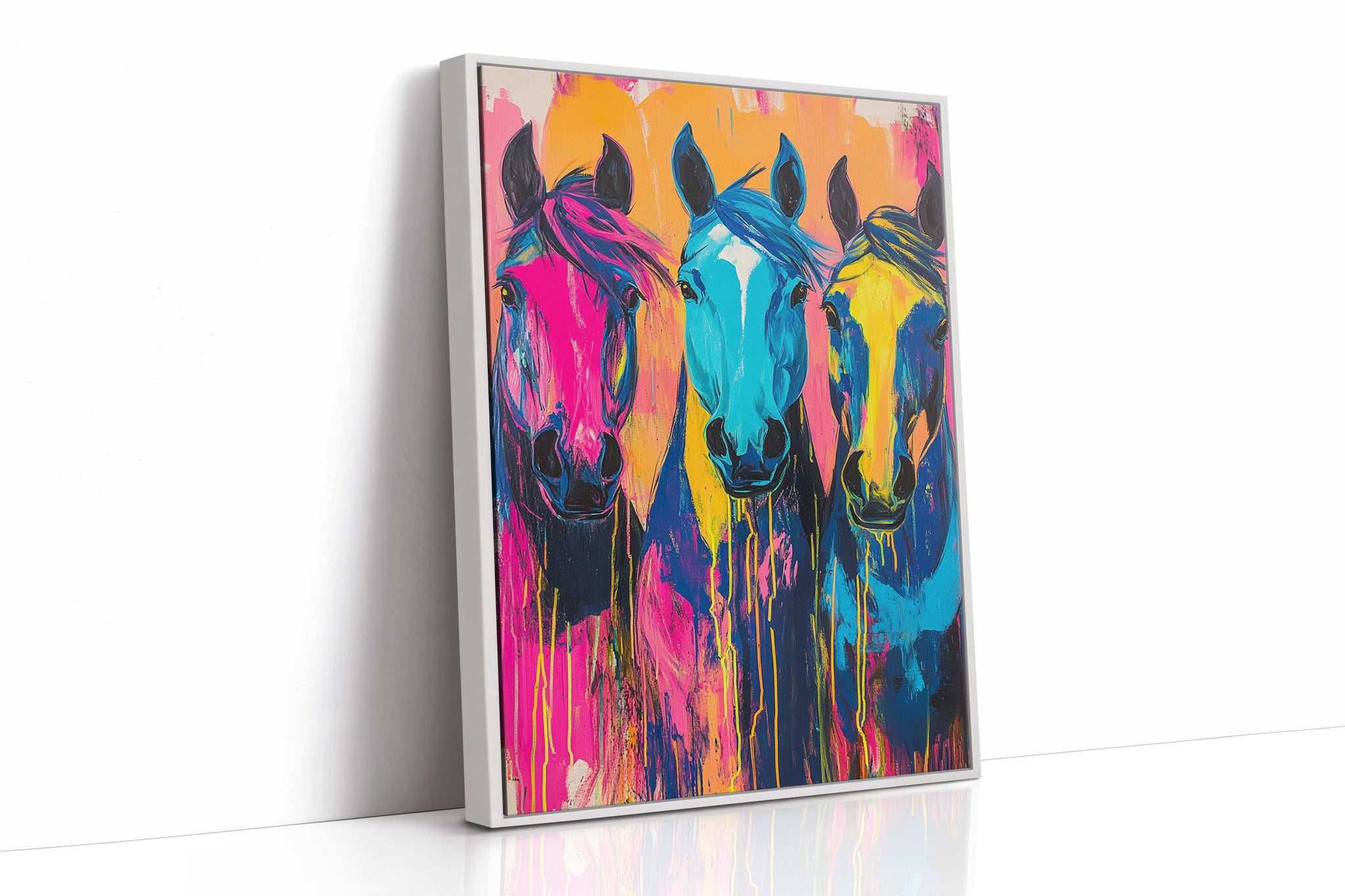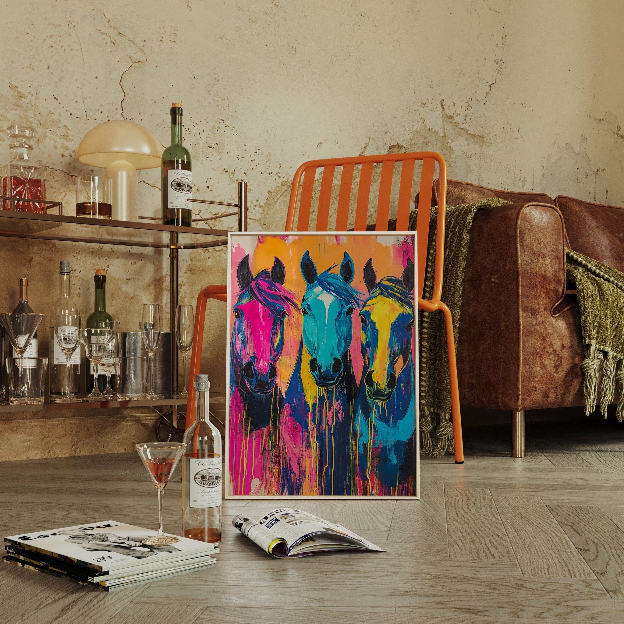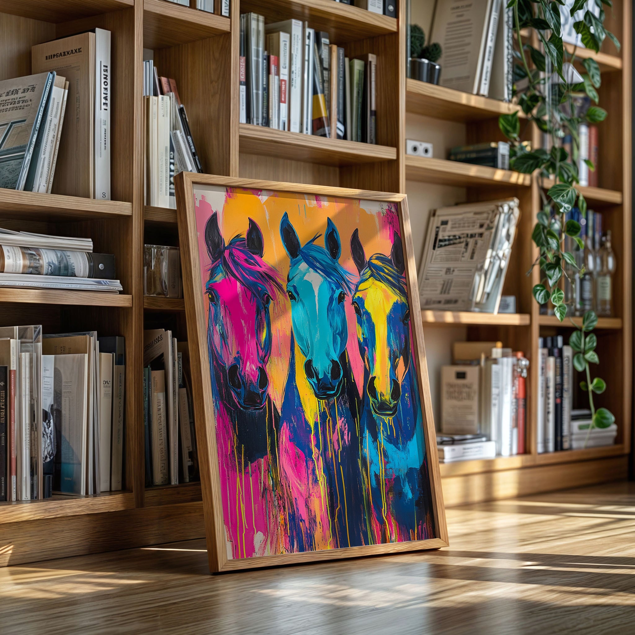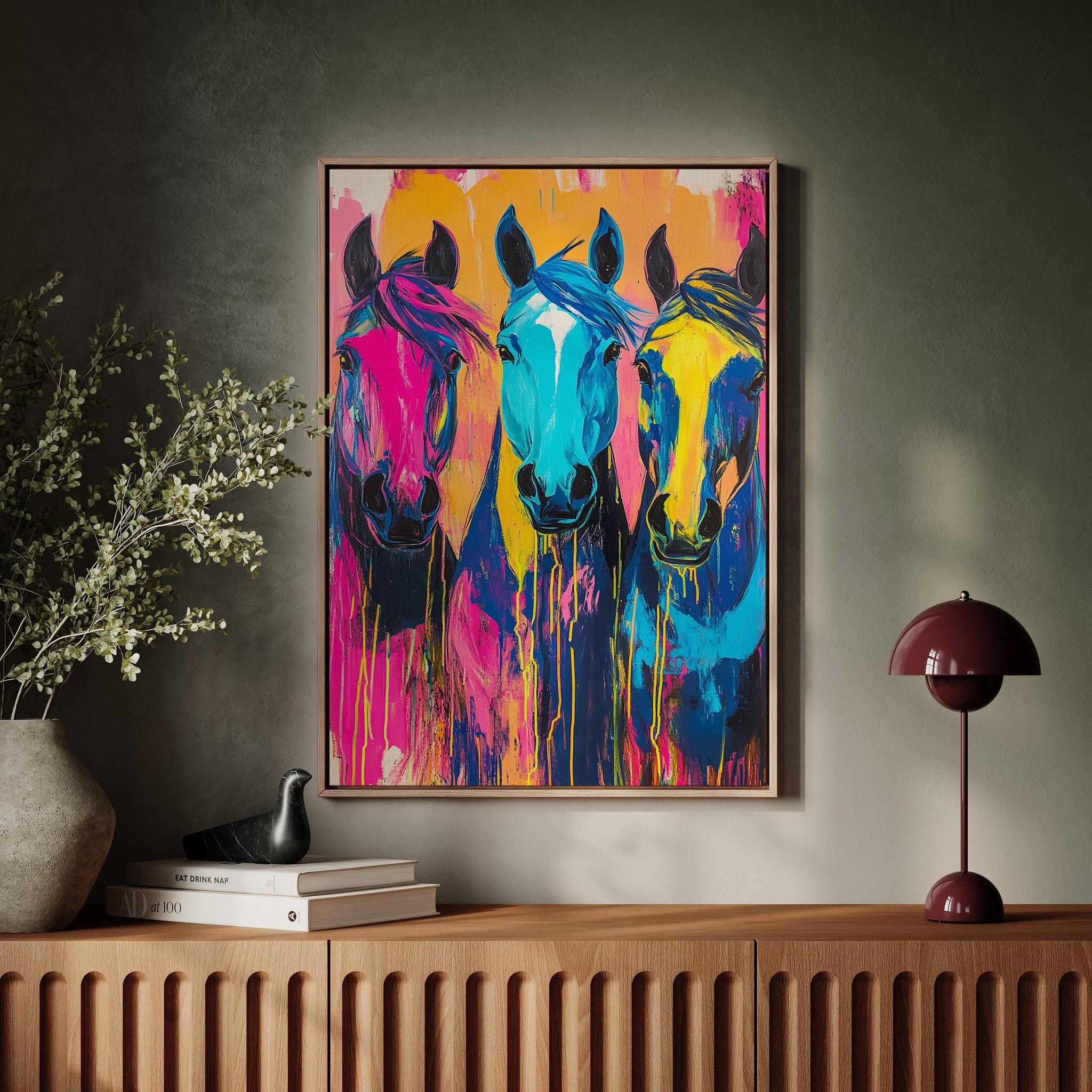 In the fading light, colors burst forth as three spirited horses emerge, their vibrant hues dancing in the evening glow. Part of our Eclectic Bohemian collection, this piece captures the untamed energy of the wild. A bold statement for living rooms, creative studios, or eclectic galleries. Each artwork is crafted with vibrant care to bring an explosion of color to your space.