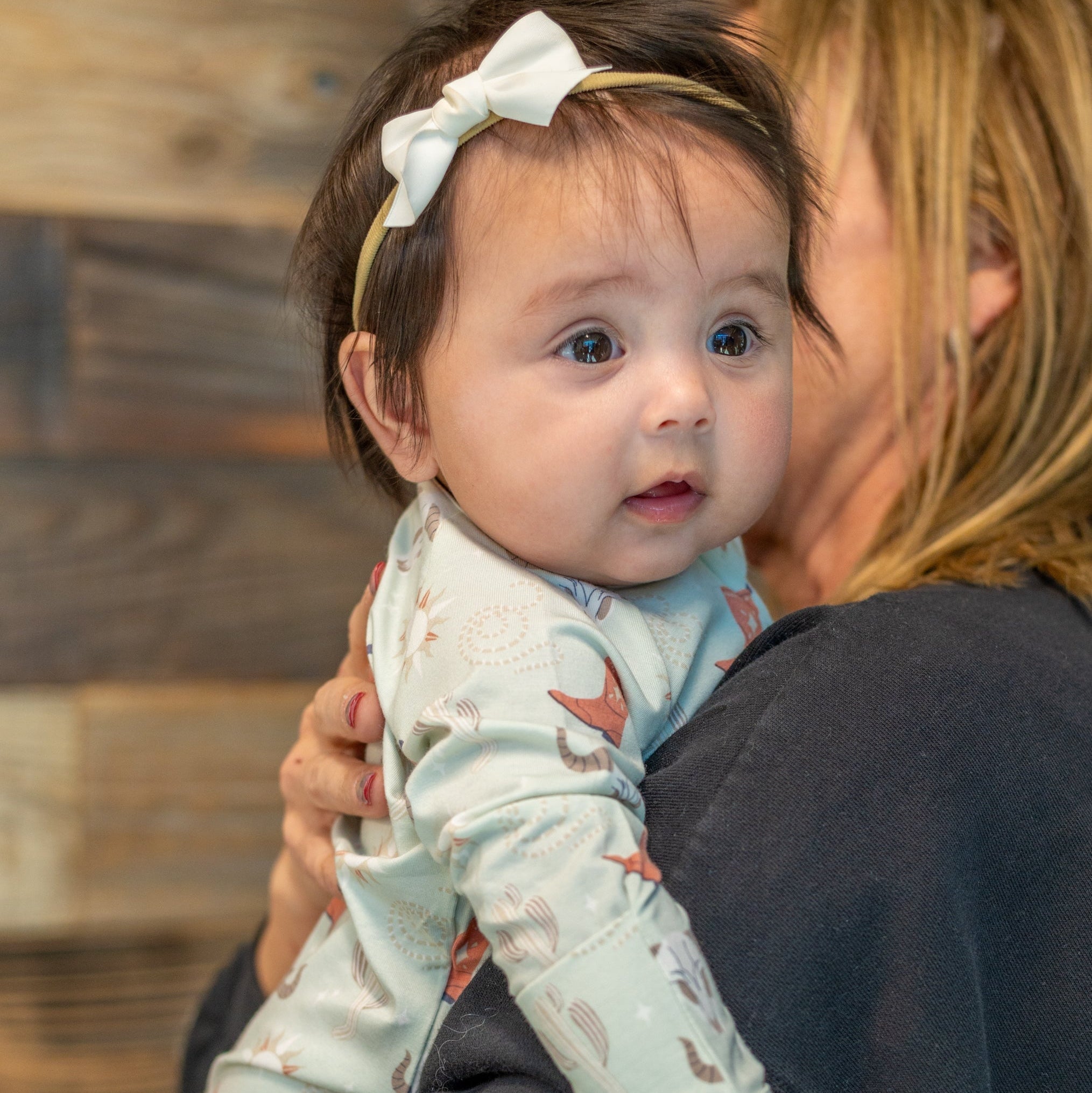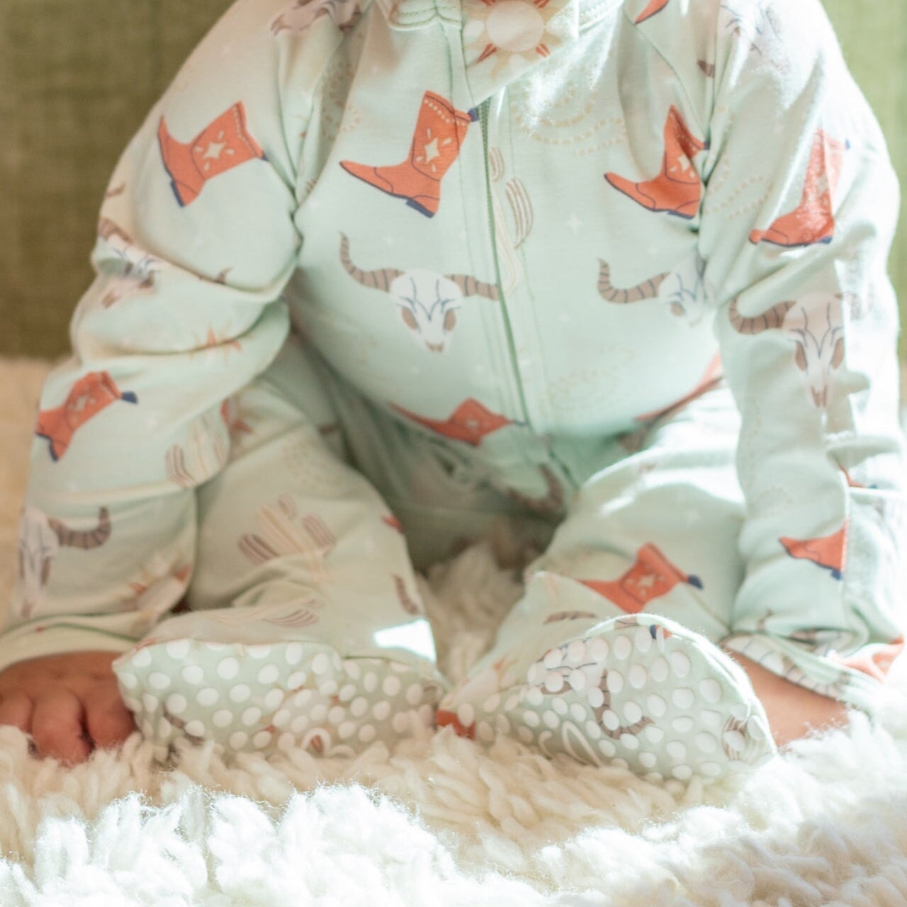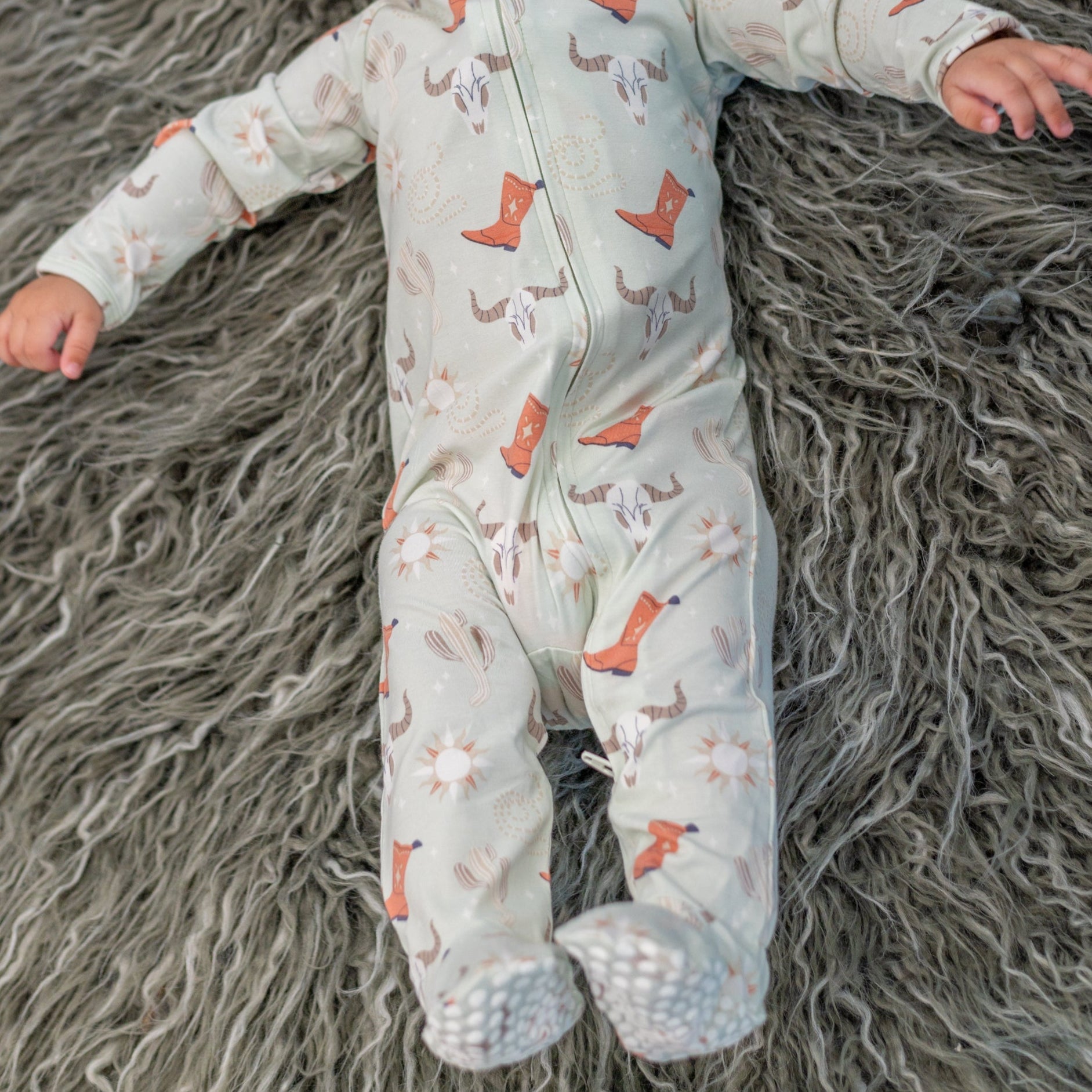 Ask and you shall receive. This yummy footie is equipped with a smooth 2-way zipper, silicone grips on the foot pads and fold-over handcuffs. Plus our silky-soft fabric hugs in all the right places to show off those baby curves.