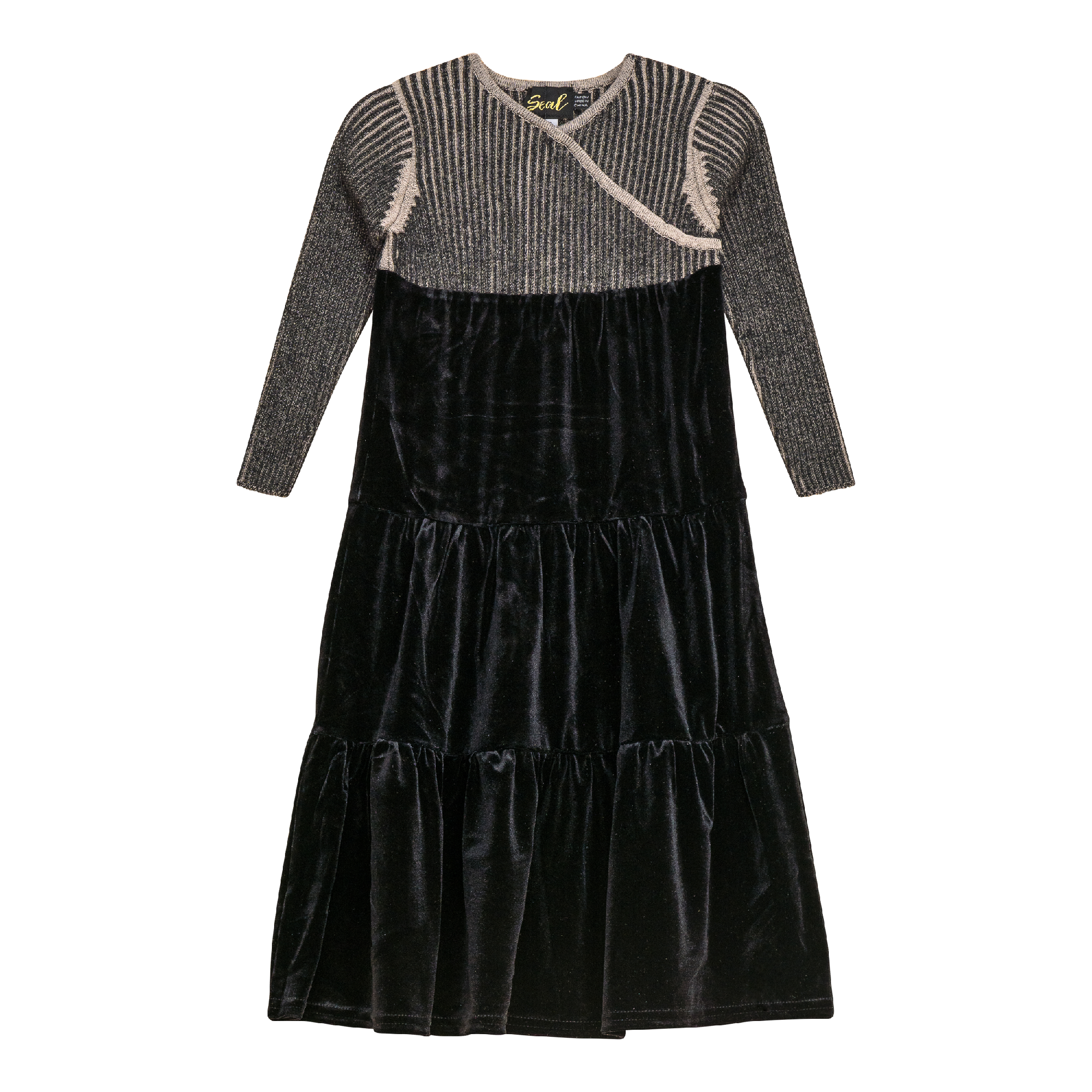 Girls long sleeve 2 tone wrap dress with rib knit at the top and slinky velour at bottom, rib knit bottom with center back invisible zipper.ֲ