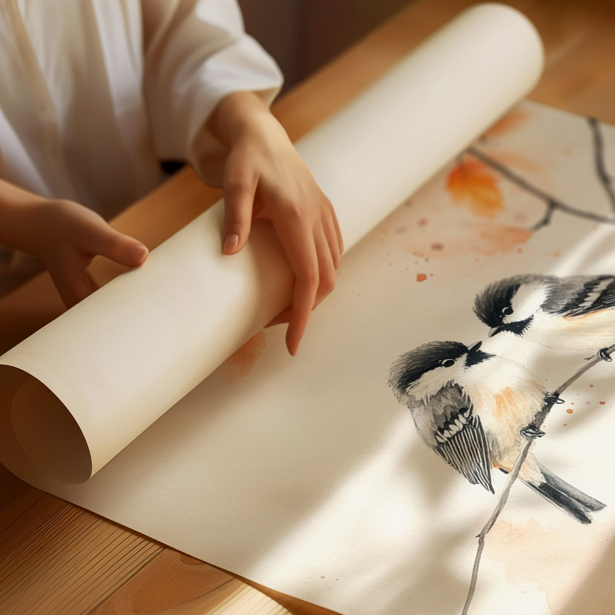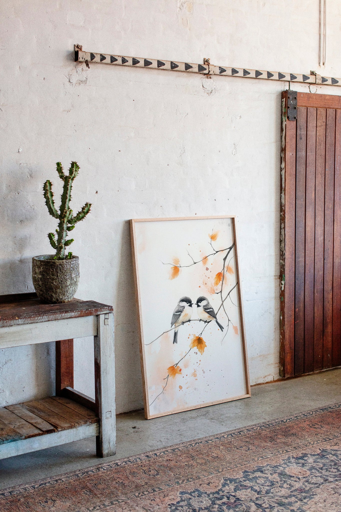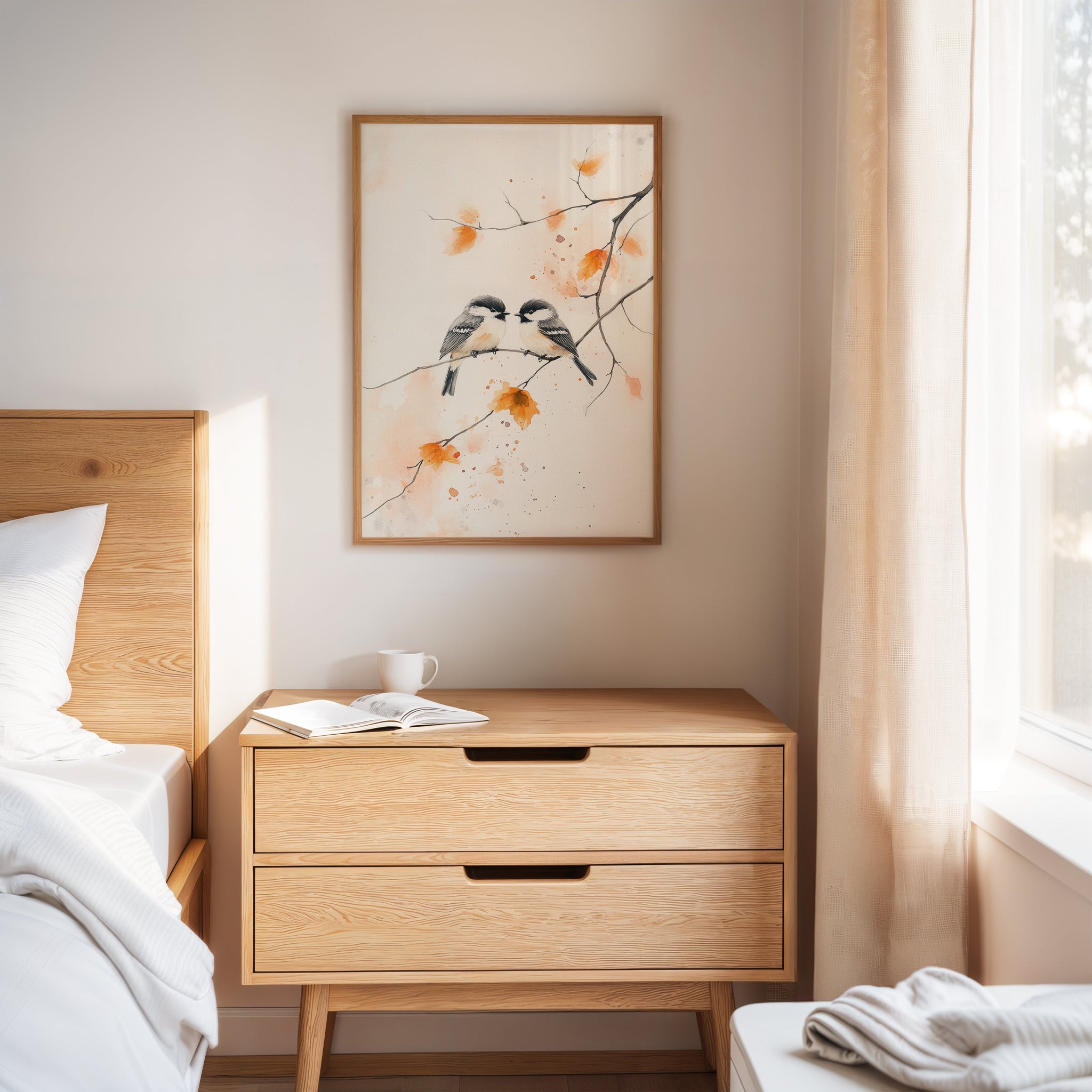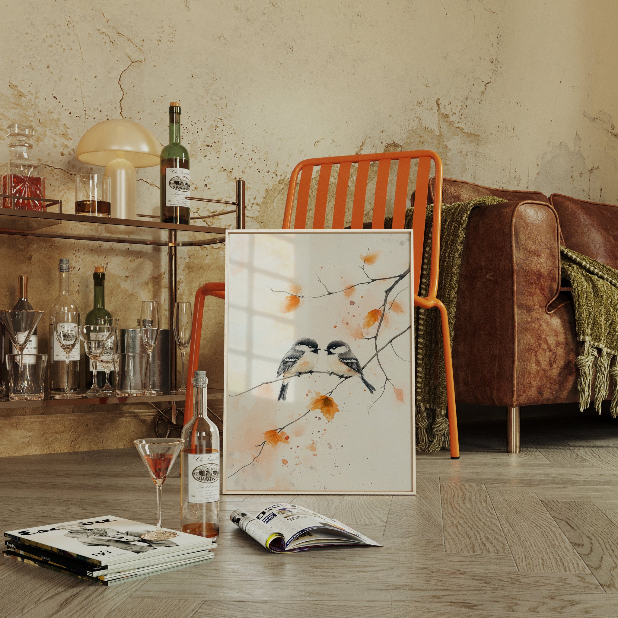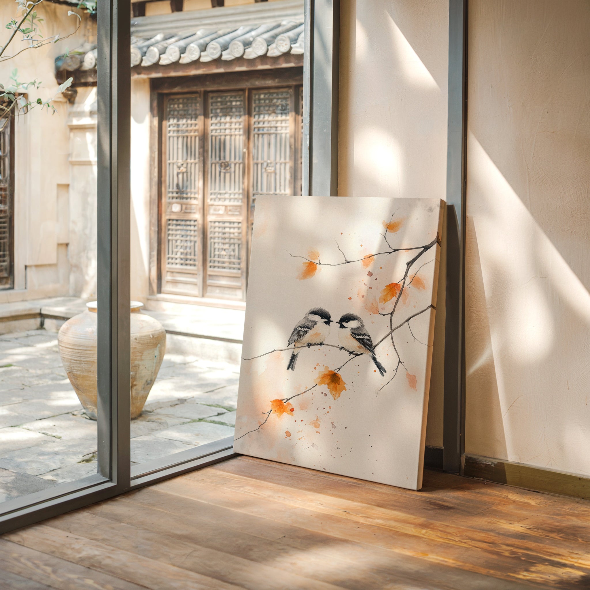 Embrace the gentle embrace of nature with 'Autumn Whisper Serenade,' a captivating piece that brings the tranquility of a cozy woodland scene into your living space. This artwork captures two delicate birds perched on a branch, surrounded by the warm hues of fall leaves, evoking a sense of peaceful companionship. The subtle watercolor strokes and minimalist design blend seamlessly with both traditional and modern decor, making it a versatile addition to your art collection. Perfect for those who appreciate the beauty of nature and the serenity it brings, this piece will infuse any room with an aura of calm and introspection. SKU: AL0756